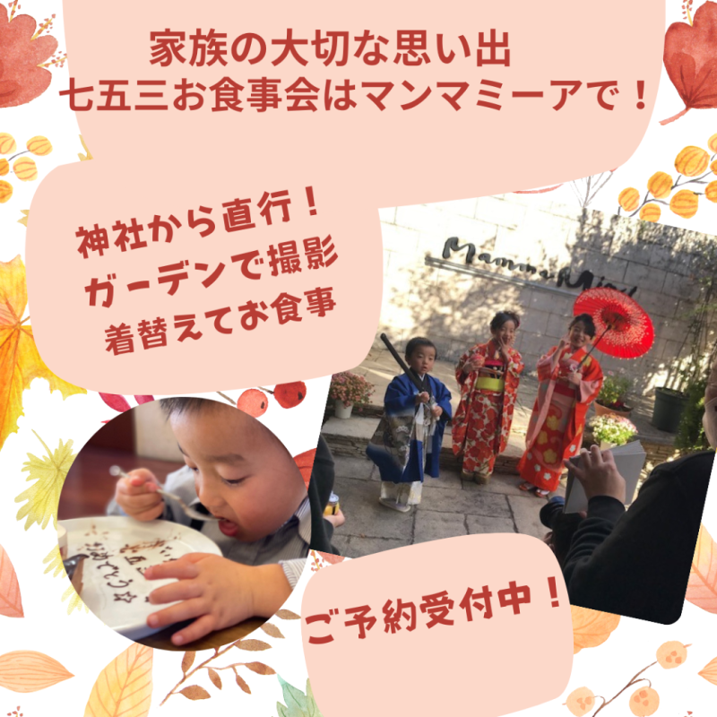 2025.09.30 七五三のお祝いはマンマミーアで お子さまの健やかな成長を願う大切な節目 ― 七五三。 ご家族の思い出に残る特別な一日を、マンマミーアでゆったりとお過ごしください。 ⛩️ 神社から直行OK! お参りの後はそのまま当店へ。 広々としたガーデンでの記念撮影や、お着替えのご用意も可能です。 お子さまから大人の方までお楽しみいただけるお食事をご用意しております。 ☎️ ご予約受付中 ご家族の笑顔があふれるひとときを、ぜひマンマミーアで。 お気軽にお問い合わせ・ご予約ください。 お知らせ 前の記事へ 一覧へ戻る 次の記事へ