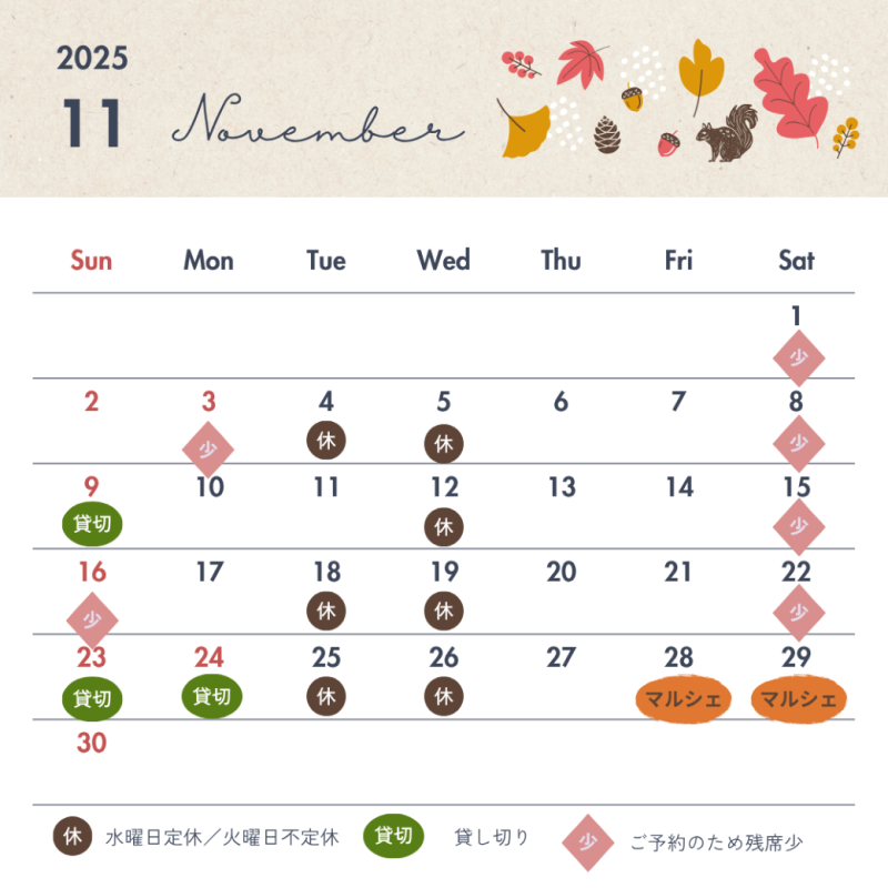 定休日以外にも貸切や一部貸切の日がございます。ご了承ください。