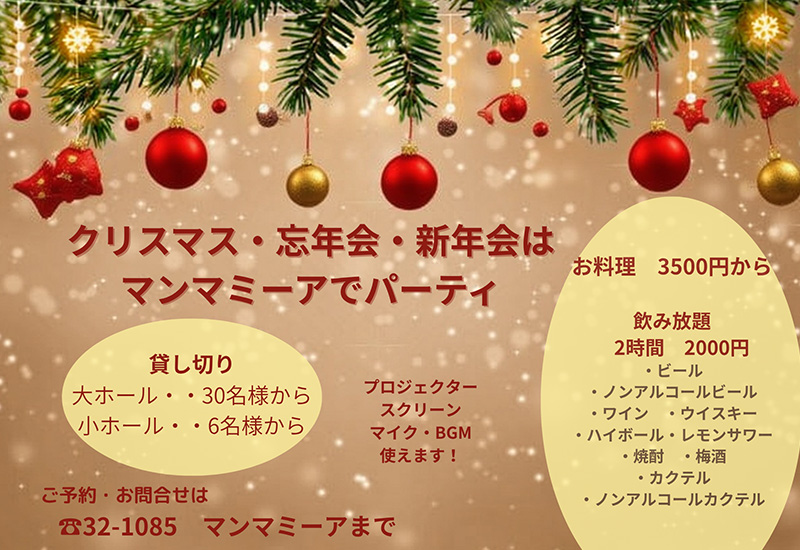 2025.11.05 クリスマス・忘年会・新年会プラン 大切な仲間やご家族との集まりにぴったりなパーティプランをご用意しています。 🍴お料理:3,500円~ 🍷飲み放題(2時間):2,000円 (ビール・ワイン・ウィスキー・ハイボール・焼酎・梅酒・各種カクテル、ノンアルコールも豊富にご用意) 【貸切も可能】 大ホール:30名様~小ホール:6名様~ プロジェクター・スクリーン・マイク・BGMもご利用いただけます。 ご予約・お問合せはお気軽に 📞 0263-32-1085 マンマミーアまで お知らせ 前の記事へ 一覧へ戻る 次の記事へ